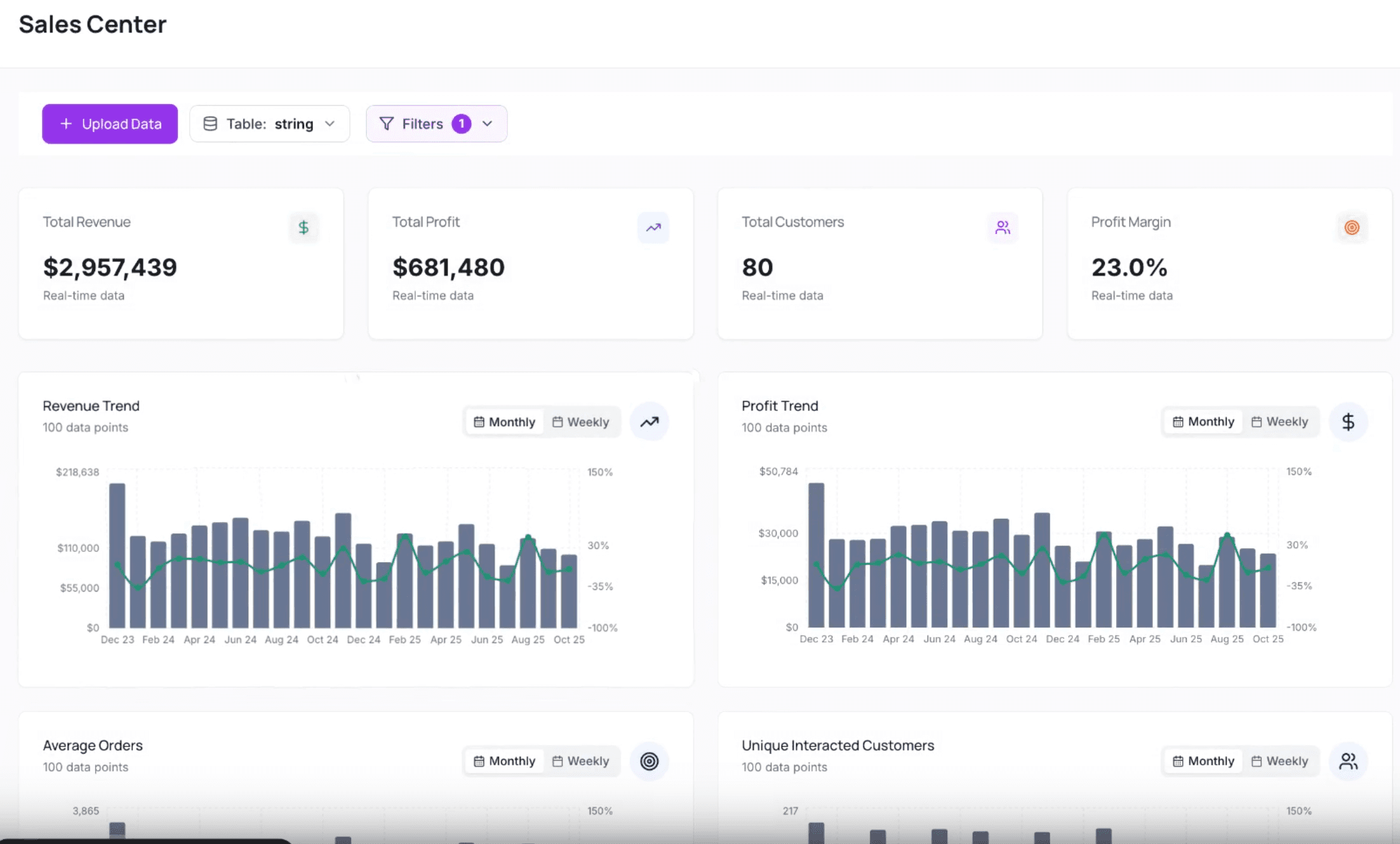 A sales center that shows performance by rep, customer, product, and region. Prelude’s AI analyst answers questions like “Which reps are slow to follow up?” or “Which products drive the most repeat revenue?” so you can coach and focus.